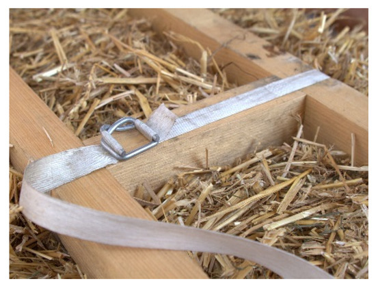 The vertical compression of the wall, measuring about 2 cm per row, was exerted on wooden slats by means of 2 or 3 hydraulic jacks every wall and was maintained by constraining the system at three points: in the center, with a polyester textile composite strap; and on the sides, with screws fixed to the uprights (Figure 7 and Figure 8). Finally, the straw bales weighed 17 kg and had a density of about 104 kg/m3.