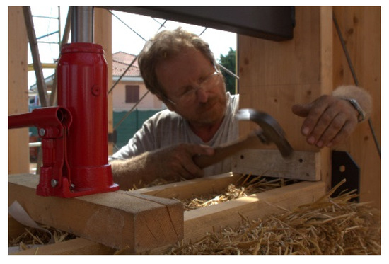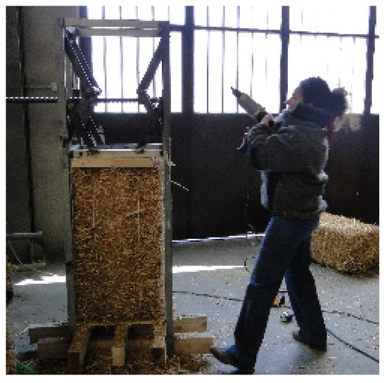 The pre-assembled prototype was designed as a set of modular elements, which are repeated on the six sides of the building. By placing the straw bales on their edges (sides), it was possible to make the most of their insulating capacity and reduced thickness (35 cm of straw plus coating). In this case, the pre-compression of the wall was carried out in two distinct phases. Each single straw bale was first pre-stressed and bound with a specially designed baler machine (Figure 13). After being inserted into the wooden formwork, the tying ropes of the bales were removed. This operation allowed them to expand and to resume their initial shape and size, thereby avoiding the formation of empty spaces that would otherwise have been generated by the irregular shapes that characterize straw bales collected in the field. In this way, it was possible to ensure a more homogeneous density.