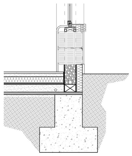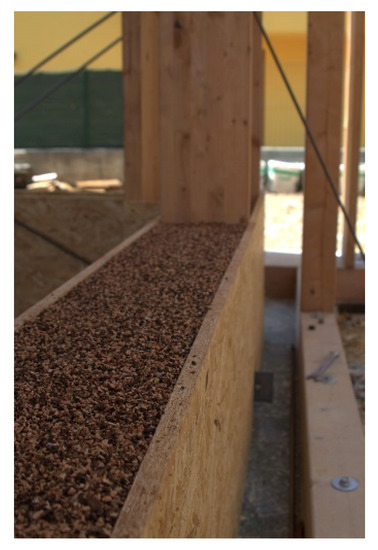 The same attention paid to avoiding water infiltration was also paid to the foundations, where a sort of wooden formwork filled with granular cork keeps the first layer of straw bales away from the ground, including a uniform draining and insulating material support (Figure 11 and Figure 12).
