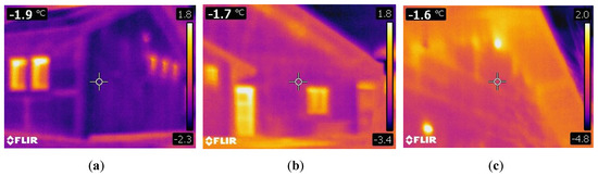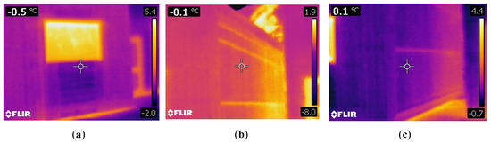 Thermal images of pre-assembled prototype facades. (a) East facade; (b) upper part of the North facade; (c) lower part of the North facade.