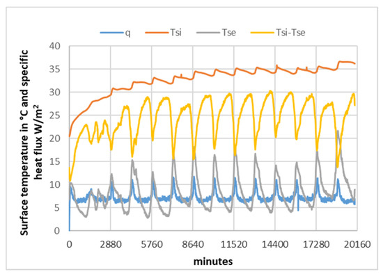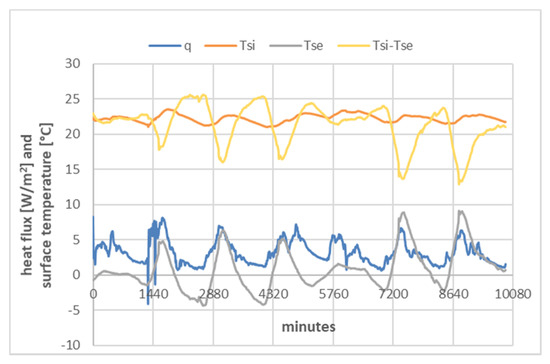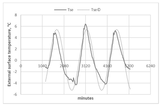 A time shift, ∆T, of 19.3 h and an attenuation of the heat flow of 0.23 were also calculated by comparing the initial phases of the equations for Tsi and Tse. The same methodology had been applied and tested in previous research [17,18,19].