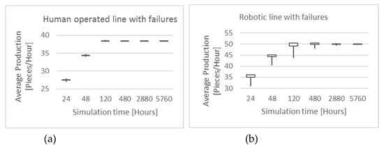 | Simulation Time [h] | Production Limit PL [Pcs.] | Human Operated Line | Robotic Line | ||||
