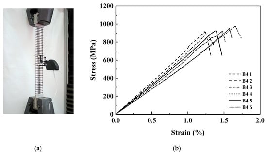 (a) Scheme of the tensile test; (b) stress–strain response curves of textile specimens under tension.