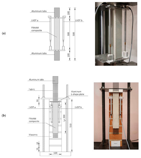 Six FRAAM composite strips externally bonded on brickwork substrate were used to carry out direct shear tests. Masonry prisms were produced by stack-bonding eight half bricks with 10 mm thick mortar joints. Modern clay bricks, with compressive strength equal to 42 MPa (CoV 5.26%) measured according to EN 772-1, and a M5 lime mortar were used. Nominal dimensions of prisms were 120 mm × 120 mm × 510 mm. The 300-mm-long and 50-mm-wide FRAAM composite strips, bonded to the 120 mm × 510 mm prism face, as reported in Figure 3b, were produced by embedding fabric at the mid matrix thickness, allowing some fabric to be left bare outside beyond the loaded and unloaded edge. Specimens were moist-cured for 7 days and then stored in laboratory conditions for 21 days until testing. Single lap direct shear tests were then carried out to study the shear debonding of FRAAM to masonry substrate. The bare fabric on the top edge, after being bonded to aluminum tabs, was pulled up being the masonry prism restrained to the testing machine base using a steel plate and four bolts. Two LVDTs were installed on the masonry surface next to the loaded edge of the FRAAM composite. They reacted off of a thin aluminum L-shape plate glued to the first transversal fiber bundle outside the bonded area. The global slip s was defined as the average of the two LVDTs readings. Tests were performed under machine stroke control at a rate of 0.18 mm/min and test data were logged with a sampling frequency of 5 Hz [14]. The surface of the masonry prisms was roughened to promote adhesion of FRAAM composite. The single-lap shear test set up is reported in Figure 3b.