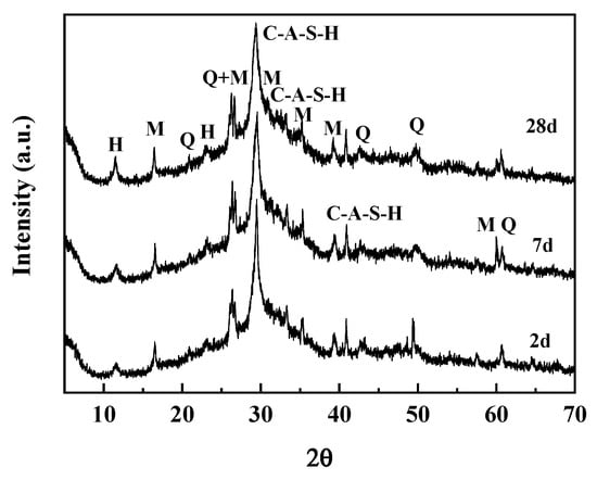 Figure 4 shows the X-ray diffractograms of the pastes obtained by alkaline activation of the reactive powders blend after 2, 7 and 28 days of curing at 20 °C.