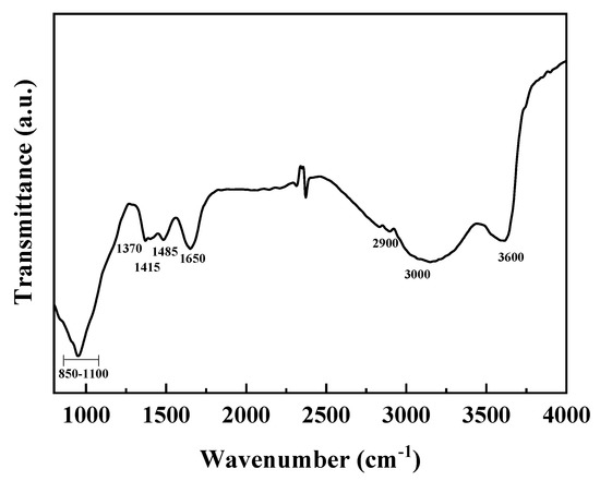 The wide and broad region between 2900 and 3700 cm−1 can be attributed to hydrogen-bonded surface hydroxyl stretching vibrations of H2O molecules. In particular, the band centered at 3600 cm−1 is attributed less strongly hydrogen-bonded interlayer water molecules. The broad peak centered near 3000 cm−1, instead, is due to the O–H stretch of strongly polarized H-bonded water in the interlayer of the cementitious minerals. The band at 1650 cm−1 can be attributed to O–H bending mode of molecular water.