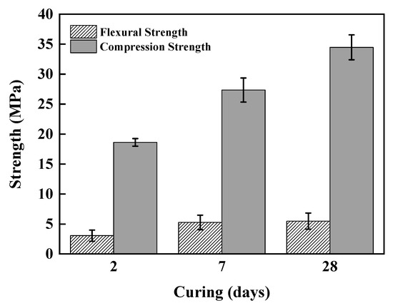 Compressive and flexural strengths were determined on prismatic specimens with dimensions of 40 × 40 × 160 mm after 2, 7 and 28 days of curing according to EN 1015-11. All the values were obtained as the average of three tested specimens.