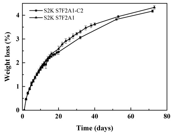 Alkali-activated materials are usually characterized by significantly higher drying shrinkage and moisture loss than traditional OPC, up to six time higher which can result in cracking and loss of durability and serviceability in restrained elements [41]. The type of reactive powders and the type and content of alkaline activators play a pivotal role in determining the extent of the shrinkage [42]. To mitigate the free shrinkage, 2 wt% of CaO on reactive powders was added as additive in mortar mix design. Its reaction to give calcium hydroxide with a volume increase of around 90% provides an expansive strain that partially compensates the shrinkage of the alkali-activated mortars. To highlight and discuss the modifications induced by CaO on the free shrinkage and mass loss behavior of the matrix, a mortar with the same composition without CaO has been used as reference (identified as S2KS7F2A1). As can be observed from Figure 9, the use of CaO lowers the overall free shrinkage from 2800 με to ≈1800 με, with a reduction of about 35%.