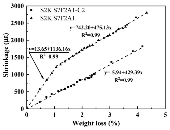 Furthermore, it can be observed in Figure 11 that CaO causes a change in the slope of the shrinkage-mass loss curve. Reference mortar is characterized by a viscous response, with an early significant shrinkage with low moisture loss. This behavior is often observed for AAM and can ascribed to the structural incorporation of alkali cations in C–A–S–H that determines a reduction in the stacking regularity of C–A–S–H layers and is responsible of their easier tendency to collapse and redistribute upon drying [43]. The reference matrix shrinkage–mass loss curve can be described in terms of two linear steps, as reported in Figure 11.