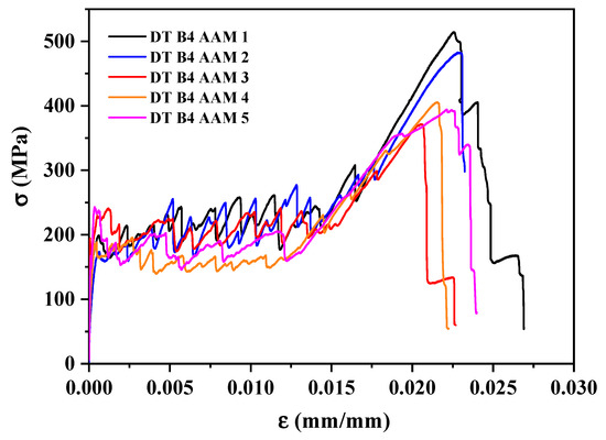 In Figure 12, the tensile tests, reported in terms of stress vs. strain response curves are shown. Stress was calculated according to Equation (2). Strain was calculated by dividing the recorded displacements by measurement base of the devices.
