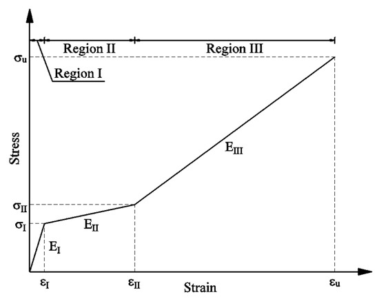 In region II the slope of the crack development stage was calculated by fitting the stress–strain curve between points (σI, εI) and (σII, εII) [45]. Stress σII and the corresponding strain εII define the point of transition between region II and region III, which corresponds to the onset of the linear branch of the stress–strain curve where the applied load is carried out only by the fibers. The fitting process provides a slope that is different from that corresponding to the line connecting points (σI, εI) and (σII, εII).