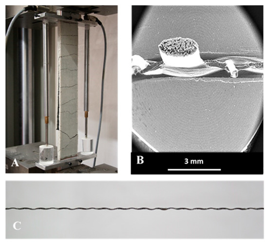 In region III, the load is borne by the reinforcement in the cracked area of the specimen; thus, the composite stiffness in that region should be equal to the stiffness of the reinforcement. The actual slope was found to be lower than the expected value. This finding can be attributed to two phenomena that can occur. The former is the failure of some filaments occurring simultaneously to the matrix cracking as a result of the previously described stress concentrations. The latter is that some of the filaments that are inside the core of the yarns are not bonded to the outer ones, as shown in Figure 14B. This causes a non-optimal loading transfer [47]. Composites then fail by sequential tensile failure of the fiber bundles. The misalignment that is shown in Figure 14C is acquired during weaving of the textile. The waviness causes a strain reserve in the textile. In the crack development stage (region II), with the increasing of applied displacement, textile recovers the strain reserve thus causing numerous matrix cracks and spalling. The waviness is thus also responsible for the large extent of region II. Only when the initial misalignment is recovered stress–strain response moves to region III. Furthermore, the recovering of the strain reserve initially stored in the waviness of basalt textile caused a delayed loading of the reinforcement that produced, in the FRAAM composites, a stress–strain response shifted towards larger strains [47], confirming the outcomes of the tensile characterization of textile reinforced inorganic-matrix composites made up with carbon and basalt stitch-bonded textiles reported by D’Antino et al. [45].