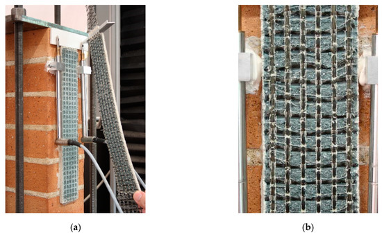 In recent decades, significant improvements in the technologies and products available for the external strengthening and retrofitting of historical masonry structures and more recent structural elements have been developed. The first marketed family of products, Fiber Reinforced Polymer (FRP) composites, had fast and facile installation procedures, were lightweight, and showed good strengthening properties [1,2]. Despite the indisputable advantages described above, FRPs soon revealed relevant drawbacks, such as, among other things, low compatibility with the stringent requirements implemented for protecting buildings that are part of cultural heritage, installation problems in the presence of wet surfaces, and low thermal and fire resistance [3,4,5]. Thus, a second generation of products, based on fabric embedded in an inorganic matrix (cement or lime-based mortars), was formulated. These are referred as Fabric-Reinforced Cementitious Matrix composites (FRCM), Textile-Reinforced Mortars (TRM), Cementitious Matrix-Grid (CMG), and Inorganic Matrix-Grid (IMG) composites [6]. Extensive experimental and theoretical research activities have been carried out and are still in progress to investigate and validate the mechanical behavior and bond properties of carbon fabric-cement-based mortar composite [3], polyparaphenylene benzobisoxazole (PBO) fabric-cement-based mortar composite [7,8], glass grid-cement-based mortar composite [9], and unidirectional steel textile-cement-based/mineral-based mortar composite [10]. The general outcomes of these investigations confirmed that textile geometry, sand granulometry, mechanical properties of the constituent materials and their combination affect the load-bearing capacity, bond strength on substrate, and failure modes of FRCM composites. Furthermore, various experimental campaigns [11,12] have pointed out that tensile and shear bond tests on FRCM composites are relevant in delivering reliable design methodologies.