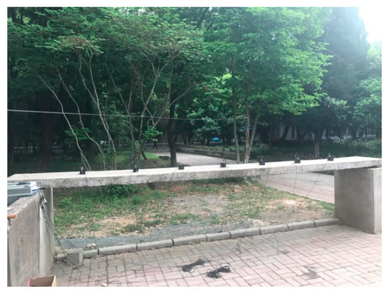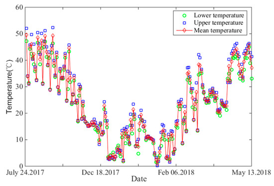 From July 1, 2017 to June 30, 2018, the RC slab was monitored for one year under natural environmental conditions and environmental temperature and vibration data were acquired. As shown in Figure 2, 45 measurement points were uniformly located on the top and bottom surface of the slab. A laser thermometer was utilized to measure the surface temperature, which allowed an error of 0.5 °C in the range of 0–100 °C. The temperature measurement and the vibration testing were carried out at the same time. Moreover, the time interval of the temperature measurement was about 15 min and vibration testing data from all sensors were captured almost simultaneously.