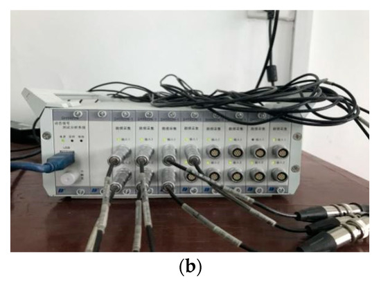 The acceleration data was captured by a DH5922 vibration testing system which has the advantages of light mass and convenient use etc. The operation temperature of acceleration acquisition instrument ranges from 0 °C to 60 °C. It is also a universal dynamic signal test and analysis system which can complete the testing and analysis of stress, strain, vibration, shock, acoustics, temperature, pressure, flow, force, torque, voltage and current, etc. The instrument has 16 24-bit IEPE input channels which are equipped with an anti-mixing filter, and supports sampling frequency up to 51.2k Hz. The system was connected with the acceleration sensor by L5 coaxial extension wire and placed in the center of the equal dividing line to collect the acceleration signal. The operation temperature of acceleration sensor ranged from −40 °C to 80 °C and its tolerance was ±1%. The acceleration sensor locations and vibration testing system are shown in Figure 3.