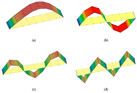 First four-order mode shapes. (a) 1st mode. (b) 2nd mode. (c) 3rd mode. (d) 4th mode.