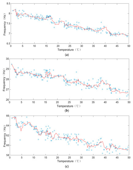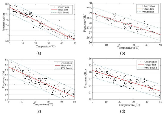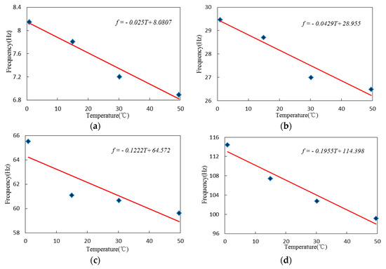 where f is the eigenfrequency; T is the temperature; k is the slope coefficient; and b is intercept. The simple linear regression model of each mode is shown in Figure 11.
