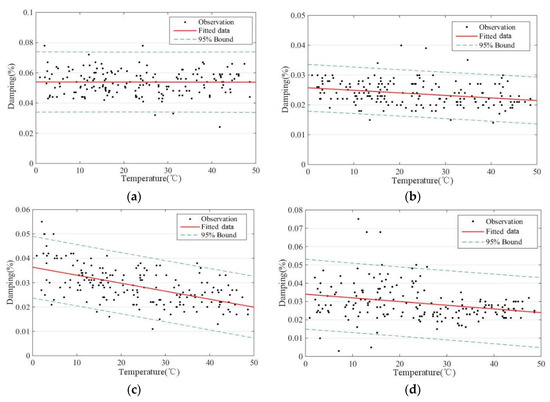 It can be observed that the damping ratio decreases with the increase of temperature. The linear fitting coefficients of damping ratios and temperatures for the first four modes of RC slab were 0.0954, 0.0647, 0.3795, and 0.298, respectively. It was found that the first modal damping was relatively not sensitive to the temperature, and the other three modes had a negative correlation with temperature. This result was probably due to the fact that a linear viscous model was used. For solids and especially for concrete the models of dissipations to be used are different [34,35].