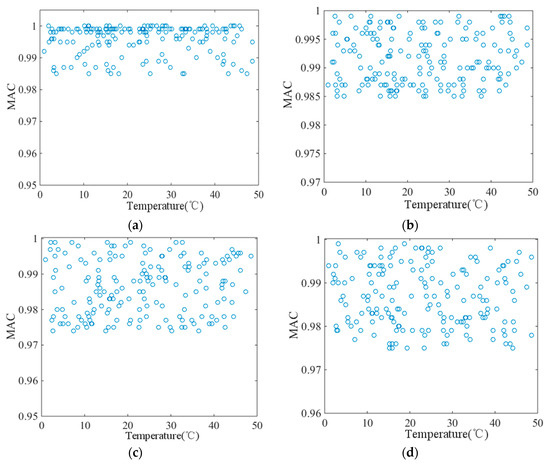 The MAC values of the first four modes with respect to temperature are shown in Figure 10, whose variation ranges are (0.985, 1), (0.985, 1), (0.974, 1) and (0.975, 1), respectively. The obtained results show that all the MAC values are bigger than 0.97 and very close to unity, which implies that there is no clear correlation between MAC value and temperature, and the mode shape is less affected by environmental factors. Because there is a lower test precision for the high-mode modal shape than the low-step modal shape, the discretization degree of the MAC value is higher than the low-mode modal shape.