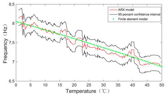 Fitting the mean temperature and the first four natural frequencies of the RC slab, the ARX models can be plotted as Figure 12.