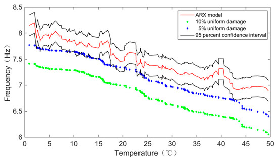 In the above experiments and analysis, the ARX model, which can reflect the relationship between natural frequencies and variations of temperature, is obtained, and it can be exploited for the damage identification problem. Theoretically, the simulated frequencies of the experimental slab can be output when the measuring temperature data are input to the model. However, if the large discrepancy is observed between the simulated and measured frequencies, something abnormal may happen and cannot be explained by temperature effects. For instance, if the measured natural frequencies are lower, the slab may be damaged. However, the significant deviation is a rather subjective criterion to judge the state of a structure. In this respect, some more objective statistical criterion needs to be discussed; if there is an abnormal change, such as a crack in structures [40,41], the procedure of damage identification will be carried out to identify whether the structure is damaged.