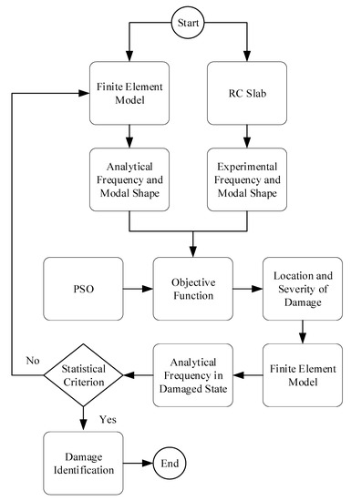 Then, the linear relationship of temperature vs. elastic modulus is adopted for the finite element model of the slab, and two damage cases are introduced, which are 5% and 10% uniform damage in all elements (20 °C). Statistical criterion and particle swarm optimization (PSO) are utilized to detect the damage considering the temperature effect. The PSO algorithm randomly generates the initial population named particles, which is first raised by Kennedy and Eberhar [43]. The characteristics of velocity and position are assigned to each particle which can be dynamically changed and updated by referring to the best particle in the search space. The algorithm as a powerful optimization tool aims to find the global optimal of an objective function, which is widely use in damage identification [44].