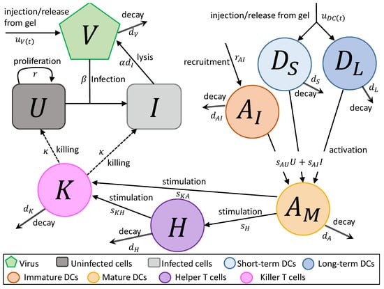 Flow diagram for the tumour–virus interaction from co-delivered dendritic cells (DCs) and oncolytic adenovirus expressing IL-12 and GM-CSF. Variables U and I are the uninfected and infected tumour cell populations, respectively; V is the virus population; and are the short-lived and long-lived DCs released from the gel, respectively; is the immature APC population already present at the tumour site; is the mature APC population; H is the helper T cell population; and K is the killer T cell population. Transition between states (e.g., uninfected to infected) is represented by a solid line, stimulation or activation is represented by a dotted line, death or decay is represented by a double arrow and programmed killing of tumour cells is represented by a dashed line.