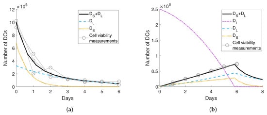 Oh et al. [] counted the number of viable DCs after a single injection released from a gel over 6 days. To fit these measurements, we fixed in Equations (1)–(9) as no tumour cells, immune cells or virus were present, and then optimised the decay rates of the long-term and short-term DCs, and , to the DC count after a single injection, see Figure 2a and Table 1. We initially considered a single decay rate for the injected immature DCs and found that the long-term model prediction was a significant underestimation. The data seems to suggest a fraction of the injected DCs live longer and contribute to a slower population decline after the first few days. As the DCs are derived from bone marrow, the difference in decay rates may be a result of heterogeneity imposed from the progenitor cell lineages that generate the DCs [,]. We, therefore, assumed that there are both long-term and short-term surviving immature DCs in the injected population. This biphasic decay rate is evident in other studies of bone marrow- or monocyte-derived DCs []. The decay rate could be modelled more accurately with a age-structured partial differential equation system, but due to the limited data, we decided this was not necessary.