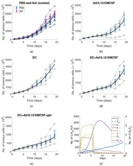 Following this, Oh et al. [] combined a single injection of Ad/IL12/GMCSF with a single injection of immature DCs. Fixing the previous fit parameters, we optimised the kinetics for the activation of immature APCs and DCs using the full model in Equations (1)–(9). Optimising the rate that infected cells recruit inactivated APCs , the stimulation of immature APCs and initial tumour size gave the model curve in Figure 3d.