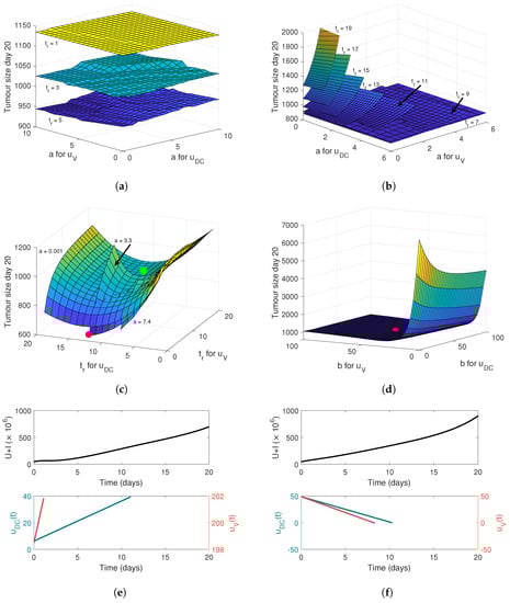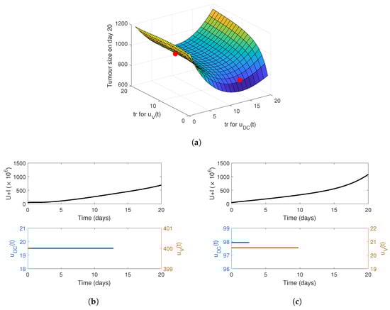 We can then simulate the effect of different release periods, , for virus and DCs. The tumour volume on day 20 as a function of the release period is plotted in Figure 4a. The surface has a global minimum tumour size of 689.24 mm , which corresponds to a 13-day release period of DCs and a single day for the virus.