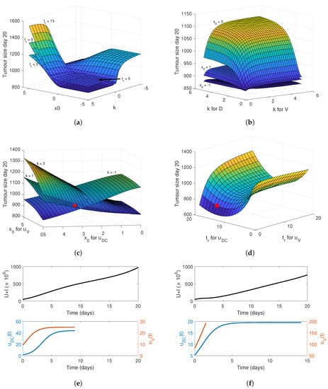 Simulating varying for virus and DCs and fixing and 3, we see that the value of the midpoint needed to minimise the tumour burden depends most heavily on the midpoint for , Figure 6c. If , then a lower is needed, whereas the opposite is exhibited if . Unsurprisingly, simulating the sigmoidal function for fixed values of and and varying for DCs and virus, we have similar dynamics to the linear and constant release curves, see Figure 6d. For an increasing sigmoidal function, the optimal tumour size is obtained when the virus is released quickly and the DCs have an extended release. Two model simulations are provided in Figure 6e,f to demonstrate the different sigmoidal release functions considered.