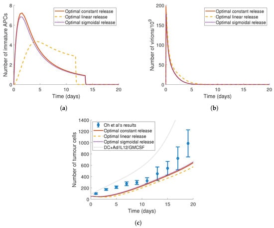 Figure 7c shows that all three optimised release curves are able to reduce the tumour burden below the average size from Oh et al.’s experiments []. The dynamics of the immature APC population () are similar for the constant and sigmoidal release curves, see Figure 7a, whereas the optimal linear release profile delays the initiation of the APC accumulation. As the virus dynamics are the same for the three release curves (Figure 7b), this suggests that the delay on the immature APC population expansion causes the decrease in tumour size under the optimised linear release therapy in Figure 7c.
