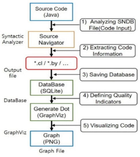 Code visualization is the process of visualizing the internal complex structure of a source code and improving the software quality based on coupling and cohesion [,]. Code visualization can consist of either commercial or open sources. Even though commercial tools are expensive and limited to linking and expanding with other open sources, we can plug and play with the static analysis, that is, critical important functions of them. In addition, open source tools are flexible, but have important functions than commercial tools. In this paper, we just use open source tools (Source Navigator, SQLite, Graphviz) for the flexible construction of code visualization. For example, source navigator (SN) parses source code [], SQLite can store the analyzed data in database tables [], and Graphviz creates images of data extracted from database tables []. In our other case, we did plug and play these tool chains with the static analysis of the commercial Liverpool Data Research Associates (LDRA) tool.