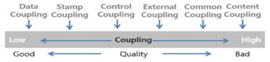 Figure 4 shows the types of coupling strength []. As the content coupling in a module increases, the density of coupling increases. In other words, as the degree of coupling strength increases, the complexity increases. Therefore, in order to improve software complexity, the degree of coupling strength must be lowered. In this study, we investigated how to extract data coupling and stamp coupling. For this purpose, we entered the information extracted from the SN into DB tables of SQLite, and thereafter defined queries to identify and measure coupling in source codes.