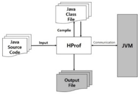 Figure 6 shows the process of HProf execution. HProf runs during compilation of Java source codes and stores the bytecodes required for the profile in a class file. Thereafter, Hprof executes the class file and communicates with the JVM. Finally, we obtain four usage modes analyzed from the source code such as heap allocation profiles, heap dump, CPU usage sampling profiles, and CPU usage time profile. However, we focus on using the CPU usage time profile in our study. This mode visualizes the number of executions and time information during the execution of the Java methods.