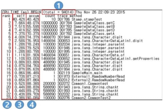 Figure 7 shows the profile mode of CPU usage time. Part ① of Figure 6 is the ‘Total’ data as the last execution time of the Java application. Part ② is the ‘Rank’ as the rank of occupancy of real time. Part ③ is the ‘Self’ as the execution time of the method itself. Part ④ is the ‘Accum’ as the total cumulative time. The performance time of the method is calculated by comparing the CPU usage profile data with the overall time.
