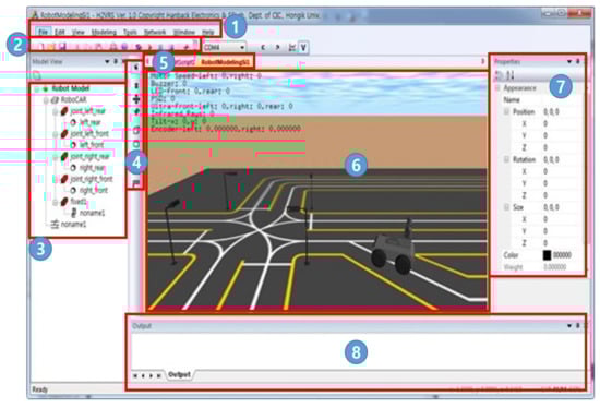 We show a smart traffic control simulator in Figure 8. In a virtual environment, this tool can simulate a variety of environments and situations (camera simulation, traffic light control, multiple vehicle creation, and so on) before operating a real smart traffic control system. In addition, the tool can create virtual robot cars, and simulate them with simultaneously operating the real car in a real environment. The smart traffic control simulator controls simulated models through the center screen. They can make a new robot car model with the part modules on the left of the screen, and represent the location data of the property window on the right of the screen. Table 5 describes detailed components of the smart traffic control simulator. The smart traffic control simulator consists of a menu bar, shortcut icon bar, model view tool bar, simulation view tab, property window, and output window.