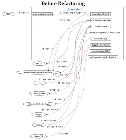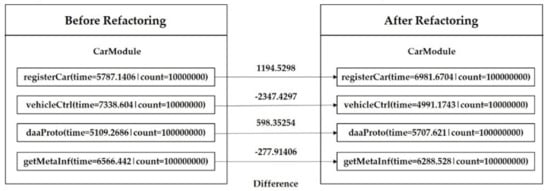 Figure 19 depicts the methods of a ‘CarModule’ with performance indicators such as execution time and the number of executions. We show performance measurements before and after refactoring methods of the same CarModule, which represented the method name, execution frequency, and execution time. The arrows connect between before and after refactoring the methods. The arrow value denotes the changed execution time. For example, a comparison was drawn for the vehicleCtrl method before and after refactoring. The difference value between these methods was −2347.4297 [ms], which indicated that the performance speed has improved after refactoring of the code.