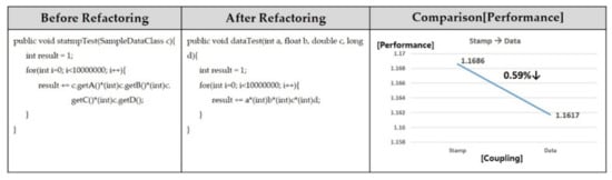 Meanwhile, in the ‘After’ area of Figure 11, we refactor with the data coupling as directly taking a parameter without calculating from the internal data of the object. In the graph on the right of Figure 11, we show the performance enhancement when refactoring from stamp coupling to data coupling. The processing speed is 1.1686 [ms] for stamp coupling and 1.1617 [ms] for data coupling. This coupling change yields a 0.59% performance improvement. When the data are received as an object through a parameter, it is copied in memory, but a copy is not made when data are directly received.