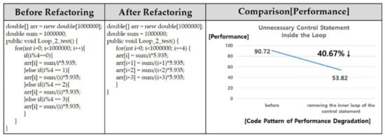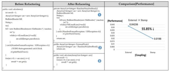 In the ‘Before’ area of Figure 12, we show the external coupling before refactoring. The random.txt file is read through the FileReader object. The corresponding FileReader object is entered into the BufferedReader class to read the data in random.txt through the BufferedReader object. As each line goes by, data are added to an Arraylist called arr, and the operation is performed inside the loop through the data. However, the external coupling cannot be completely eliminated in ‘Before’. Therefore, in the ‘After’ area of Figure 12, we improved the external coupling in three ways. The first way is to create a method that only loaded the data directly as in part ① and set it as private to prevent direct access. In the second method, as in part ②, the code sets up a getter that uses the data in another module. Finally, as in part ③, we refactor to accept only the ArrayList through the parameter and perform the operation. The improvement results are shown in the lower left graph. In the case of external coupling, the processing speed is 0.04236 [ms], and after refactoring with data/stamp coupling, the processing speed is 0.0198 [ms], which is improved by 55.85%.