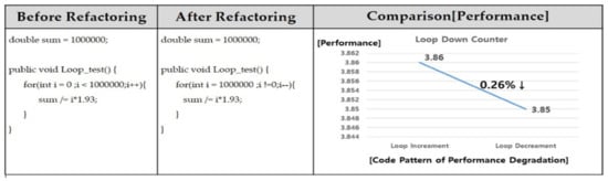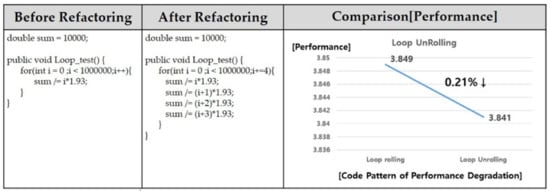 Figure 13 shows the source code for improving loop unrolling before and after refactoring. The case that is before improvement repeated the operation with i increasing by 1 from 0 to 1,000,000. Thereafter, we divide the sum by i*1.93. The code after the improvement can improve the performance by executing the functions in one iteration from i to i + 3 at once and the total number of iterations is reduced by 25%. The result is a 0.21% performance improvement that is increased by running all the loops, which takes 3.3849 [ms], and running less iterations, which takes 3.3841 [ms], that is, the performance is improved as the number of iterations decreases.