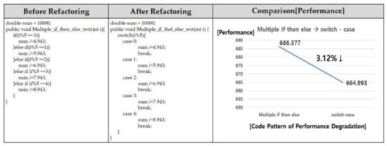 Figure 16 shows the source code before and after the improvement for multiple if-then-else statements. The code before improvement differs from the remainder when the codes are divided by 5 through multiple if-then-else statements. Depending on the remainder, the sum value of the code may have a different value. Refactoring this code into a switch-case statement puts ‘i%5′ in the conditional statement of the switch statement. Depending on the value obtained from the result, the code for different case statements is executed. The improved code takes 664.993 [ms]. In other words, the performance measurement time is reduced from 686.377 [ms] to 664.993 [ms]. This means that there is a 3.12% performance improvement. The reason for the improvement is that, when multiple if then else statements are executed, all the conditions are compared. The function is performed on the branch statement that also satisfies the condition. However, the code that is improved with switch-case statements can perform functions at once without requiring multiple comparisons.
