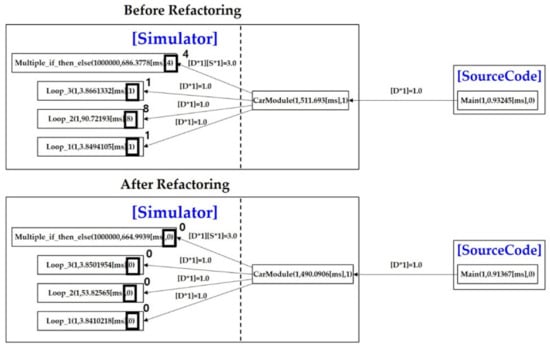 Figure 18 shows the performance between before and after refactoring of the smart traffic control simulator. After identifying CarModule with the highest coupling value of baseline time in terms of the level of the coupling mechanism in Table 5, we focus on improving the performance degradation factors of CarModule. In Figure 18, we show the original information of ‘before-refactoring’ with the number of calling, execution time [ms], number of performance degradation factors such as Multiple_if_then_else(1000000, 686.3778[ms], 4), and the changed information of ‘after-refactoring’ such as Multiple_if_then_else(1000000, 664.9939[ms], 0).