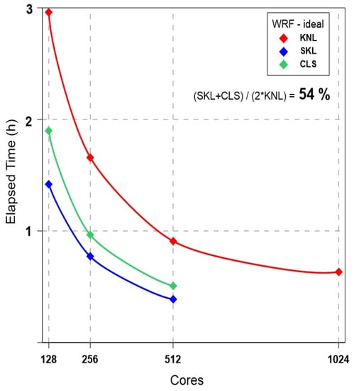 The white paper [] from DELL EMS in June 2018 compared the performances of the SKL and KNL systems with several numerical models. The Weather Research and Forecasting (WRF) model was also used to compare the performances of both systems in the paper. An experiment for the continental United States (CONUS) was conducted using WRF v3.6.1 as a benchmark model with a 2.5 km resolution, and it was applied to the inputs and outputs by the parallel-netcdf 1.8.1 library for parallel optimization. This configuration can improve the performance of a KNL system with many cores and low memory in distributing reading and writing model results. Although the white paper was intended to promote the superiority of the SKL system, the performance of the KNL system was nonetheless two to three times slower than the SKL system.