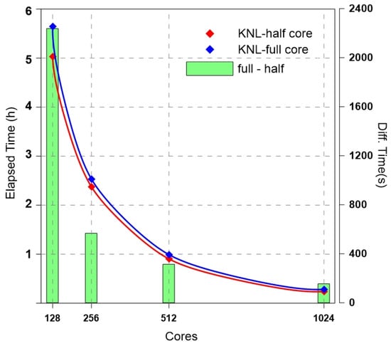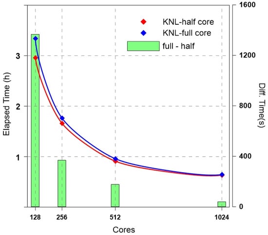 In the KNL system, the performance was also analyzed according to the number of cores (Figure 3 and Figure 4). Figure 3 shows that using half the number of cores per node in the KNL system is the most efficient method when the total number of cores is less than 256. However, there was no significant difference observed when more than 256 cores were used.