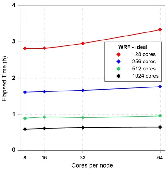 The KNL system’s performance was also analyzed according to the number of cores. Figure 11 shows the differences in performance according to the number of cores, with 8, 16, 32, and 64 cores per node. In the 128 cores experiment (red line), the case using only 8 or 16 cores per node shows the highest performance, and increasing the number of cores per node while reducing the number of nodes gradually decreased the performance. However, the performance difference was small enough to ignore when the total number of cores was more than 256. This means that the most economical method is to use all the cores of the node and reduce the number of nodes for an ultra-high parallel model.
