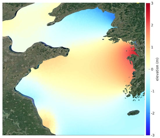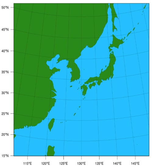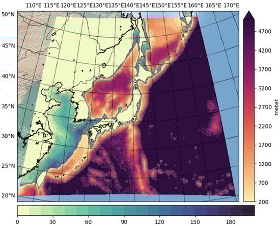 Experiments were conducted considering the real topography and external forces of the NWP. A 2048 × 2048 grid was constructed with an interval of approximately 1 minute in the region of 117° to 160° longitude and 20° to 52° latitude surrounding the Korean Peninsula (Figure 12). The depth of the model was interpolated to the ultra-high resolution grid using ETOPO2 [] data, and the vertical grid was divided into equal intervals of 30 layers to 5000 m depth from surface.