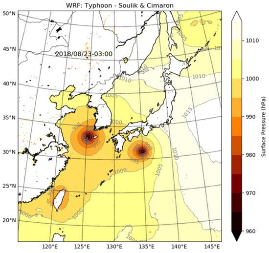 Simulation results for Soulik and Cimaron typhoons using WRF-NWP. Colors: surface pressure, arrows: wind field at 10 m.