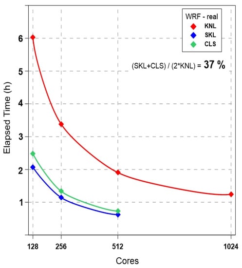 Performances of WRF-NWP by the number of cores for the real experiment: (SKL+CLS)/(2*KNL) = 37%.