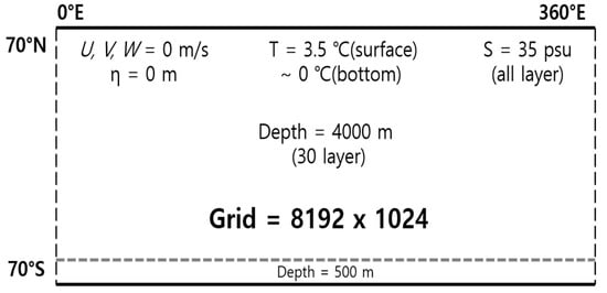 The overall depth of the model was set to 4000 m, and the depth of the Antarctic boundary was set to 500 m to represent a simple version of Antarctica. The lateral boundaries of the east and west side were set to be cyclic conditions and the vertical grid was divided into 30 layers. The initial sea surface height (SSH) and currents (U, V, W) were all set at zero, and salinity (S) was set to 35 psu. The vertical profile for temperature was set to decrease linearly from 3.5 °C at the surface to 0 °C at the bottom to represent density stratification. The time interval of model integration was 15 s.